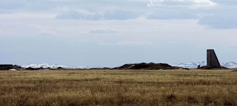 الآن، تبدو "أرض التجارب النووية" سهولا وسهوبا هائلة مسطحة تنامت فيها الأعشاب الجافة. من حين لآخر تصادفك في السهوب "هياكل مثلثة بشكل غير مألوف" تنتشر في جميع أنحاء الإقليم، لتذكرك بماضي المدينة النووي. قبل 70 عاما، كان كل شيء هناك مختلفا: فلدراسة آثار الانفجارات النووية التجريبية، كان الجيش يبني شوارع بكاملها ويشيد الجسور ويقوم حتى بتشييد ممرات مترو الأنفاق تحت الأرض بعمق 300 مترا مربعا. وكان يتم إحضار "حيوانات التجارب" إلى "منطقة التأثير"، وهذا الجزء من الموقع تحديدا أطلق عليه اسم "أرض التجار".