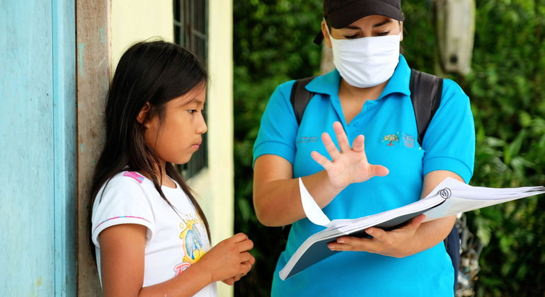 معلمة تقدم دليل دراسة لفتاة صغيرة، في منطقة نائية في منطقة الأمازون الإكوادورية لا تتوفر فيها خدمة الإنترنت، حتى تتمكن من متابعة دروسها.