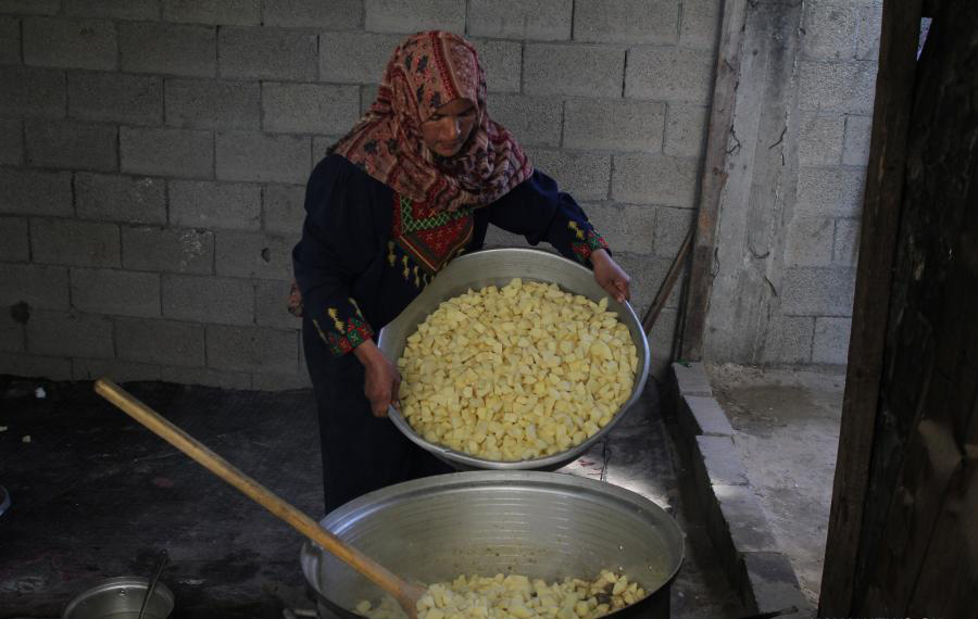 سيدة فلسطينية تدعى سميرة أبو عمرة تطبخ الغذاء للفقراء المحليين في حي الزيتون بشرقي مدينة غزة.