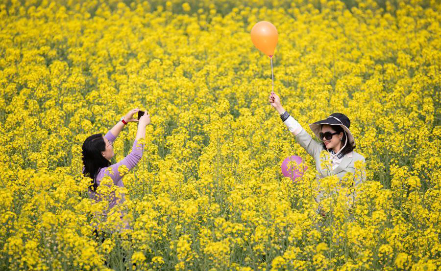 سياح يتلقطون صور وسط زهور اللفت في قرية لييان في مقاطعة سيتشوان بجنوب غربي الصين.