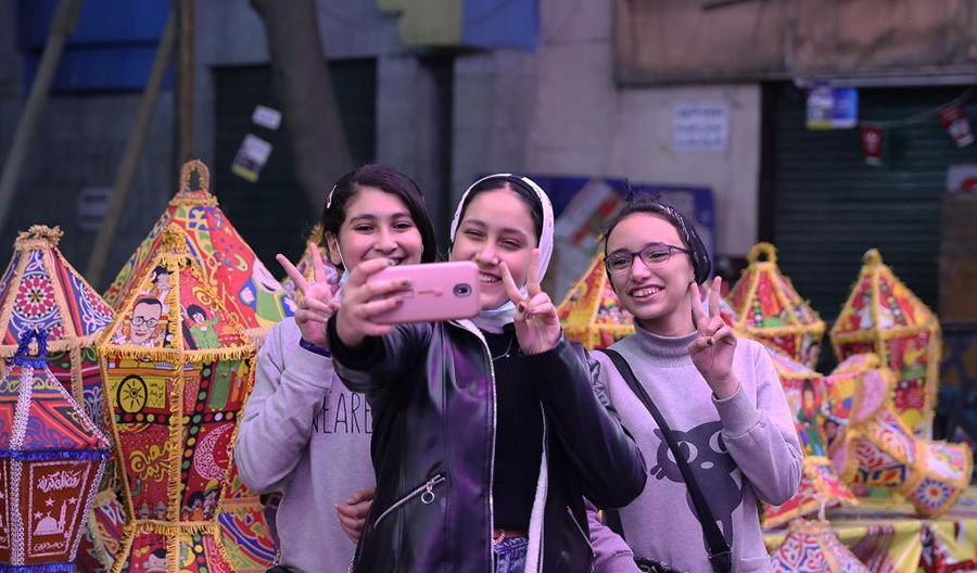 فتيات يلتقطن صور سيلفي في سوق للفوانيس في العاصمة المصرية القاهرة. بمناسبة حلول شهر رمضان المبارك، حيث يتدفق المصريون على الأسواق المحلية لشراء الفوانيس الملونة لأطفالهم أو لاستخدامها كزينة للمنازل وأماكن العمل.