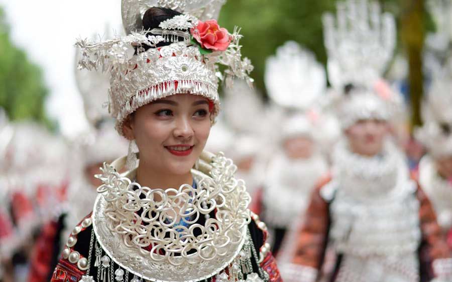 فتاة من قومية مياو تشارك في مسيرة احتفالية بمهرجان الأخوات للقومية في محافظة تايجيانغ في ولاية تشياندونغنان ذاتية الحكم لقوميتي مياو و دونغ في مقاطعة قويتشو بجنوب غربي الصين.