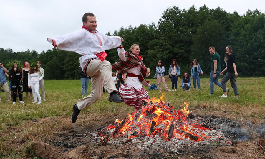 أشخاص يقفزون فوق النار خلال احتفالات مهرجان "إيفان كوبالا" في ضواحي عاصمة بيلاروسيا، مينسك.