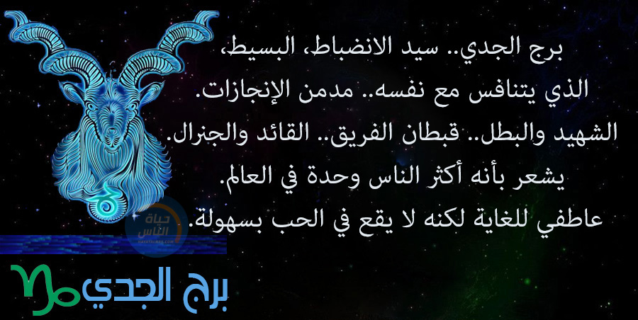 برج الجدي.. سيد الانضباط، البسيط، الذي يتنافس مع نفسه باستمرار.. الجدي هو مدمن الإنجازات. هو الشهيد والبطل. هو الوصي والقاضي. هو قبطان الفريق. رئيس الرؤساء. الجنرال. القائد. ولكن وبالرغم من ذلك يمكن أن يشعر الجدي بأنه أكثر الناس وحدة في العالم. الجدي عاطفي للغاية لكنه لا يقع في الحب بسهولة.