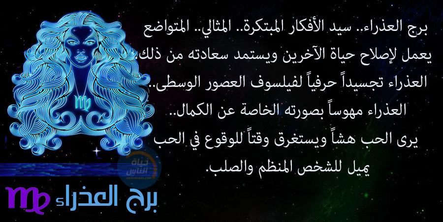 برج العذراء.. سيد الأفكار المبتكرة.. المثالي.. المتواضع، الذي يعمل لإصلاح حياة الآخرين ويستمد قيمته وسعادته من ذلك. العذراء تجسيداً حرفياً لفيلسوف العصور الوسطى.. العذراء مهوساً بصورته الخاصة عن الكمال.. يجيد قمع مشاعره ويستغرق وقتاً للوقوع في الحب لأنه ينظر للحب على أنه هش ومتقلب، لكنه يميل في الوقت نفسه للشخص المنظم والصلب.