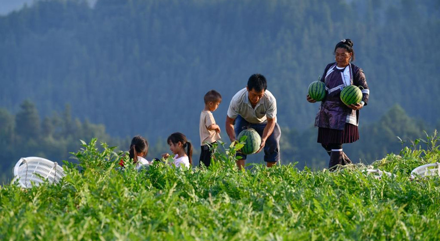 مزارعون يحصدون البطيخ في محافظة رونغجيانغ بمقاطعة قويتشو في جنوب غربي الصين.