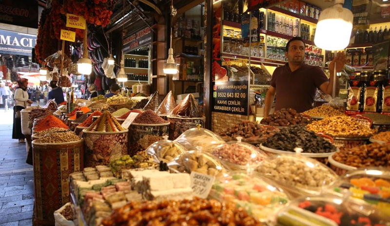 بائع ينتظر الزبائن في سوق للتوابل في غازي عنتاب بتركيا.