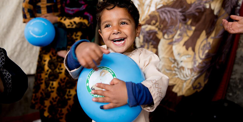 هذا الولد سعيد لأنه أخذ بالوناً. وقد يبدو لك بالوناً لا يساوي شيئاً، ولكن هؤلاء الأطفال لا يملكون ألعاباً ليلعبوا بها. ويصنع الأطفال طائرات ورقية باستخدام أكياس البلاستيك، أو يلعبون بالرمل. وهم يحبون البالونات، ويتراكض جميع الأطفال نحو المطعّمين كي يحصلوا على بالون. ونحن نوزع 1.2 مليون بالون أثناء كل حملة وطنية للتحصين ضد شلل الأطفال". هذا الولد الذي رصدت حالته اليونيسيف لا ينتمي إلى بلد محدد، فهناك منه الملايين، في مختلف بلاد العالم.