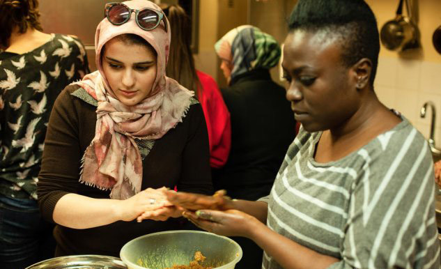 تقوم هذه اللاجئة الإيرانية بإعداد كرات اللحم مع طالبة لجوء نيجيرية في لندن. ويُظهر الطهاة السوريون والإيرانيون والنيجريون والإثيوبيون والكوبيون مهاراتهم في طهي الأطباق التقليدية ويكتسبون المهارات من خلال العمل التطوعي في شهر رمضان.