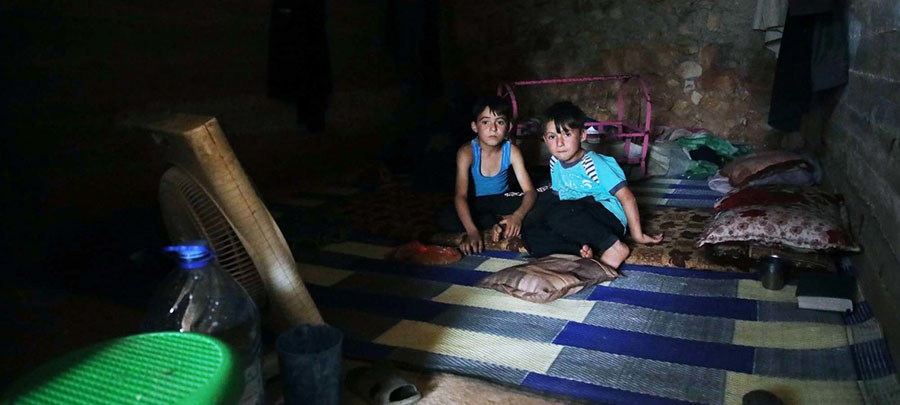 فارون من الأعمال القتالية في إدلب، سوريا: طفلان يتناولان الطعام في مكان إيواء مؤقت قرب الحدود التركية.