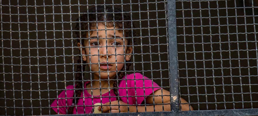 فتاة تنظر من وراء النافذة إلى عائلات نازحة وصلت من رأس العين إلى تل تامر، بعد أن فرت من العنف المتصاعد في سوريا