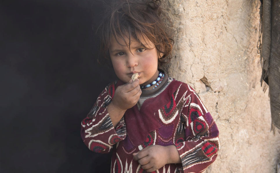 تأكل ملالي البالغة من العمر أربع سنوات الخبز الذي صنعته جدتها سردار بيبي. بعد أن عادت الأسرة إلى أفغانستان بعد 30 عاماً من العيش كلاجئين في باكستان.