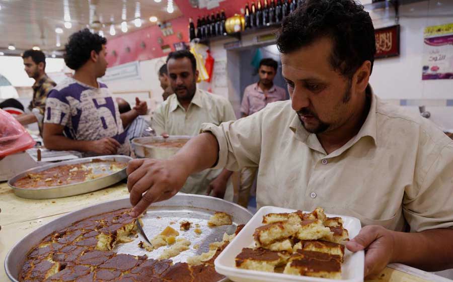 أشخاص يشترون الحلوى التقليدية في متجر في صنعاء، اليمن. يزداد الطلب على الحلوى التقليدية في شهر رمضان المبارك.