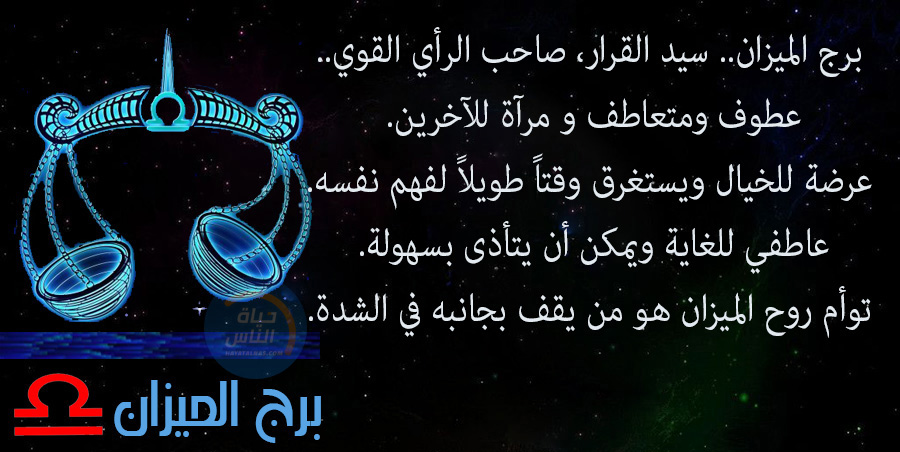 برج الميزان.. سيد القرار، صاحب الرأي القوي.. العطوف المتعاطف الذي يمكنه أن يكون مرآة للآخرين. ومع ذلك فهو عرضة للخيال ويستغرق وقتاً طويلاً لفهم نفسه. الميزان عاطفي للغاية ويمكن أن يتأذى بسهولة. توأم روح الميزان هو الشخص الذي يمكن أن يتواجد بجانبه في الشدة، وفي أكثر اللحظات ضياعاً أو إرباكاً.