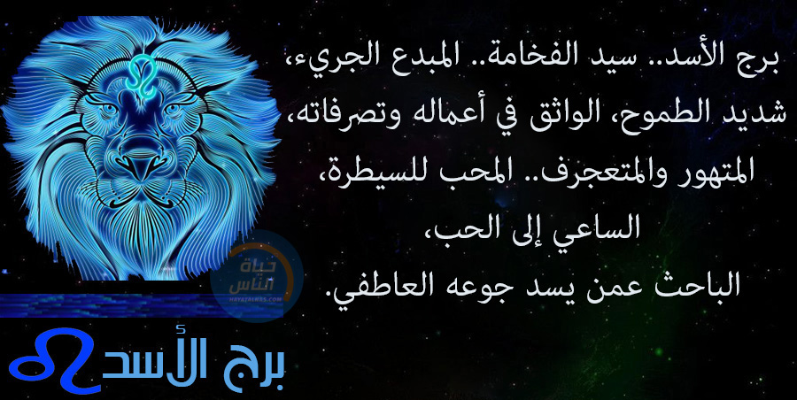 برج الأسد.. سيد الفخامة.. المبدع الجريء، شديد الطموح، الواثق في أعماله وتصرفاته، الكاره للغدر والخيانة.. الأسد المتهور والمتعجرف المحب للسيطرة، الذي يخفي نقاط ضعفه بغضبه. الأسد يعاملك بنفس الطريقة التي تعامله بها. لديه فجوة يسعى دائماً إلى سدها بالحب، يبحث دائماً عمن يسد جوعه العاطفي.