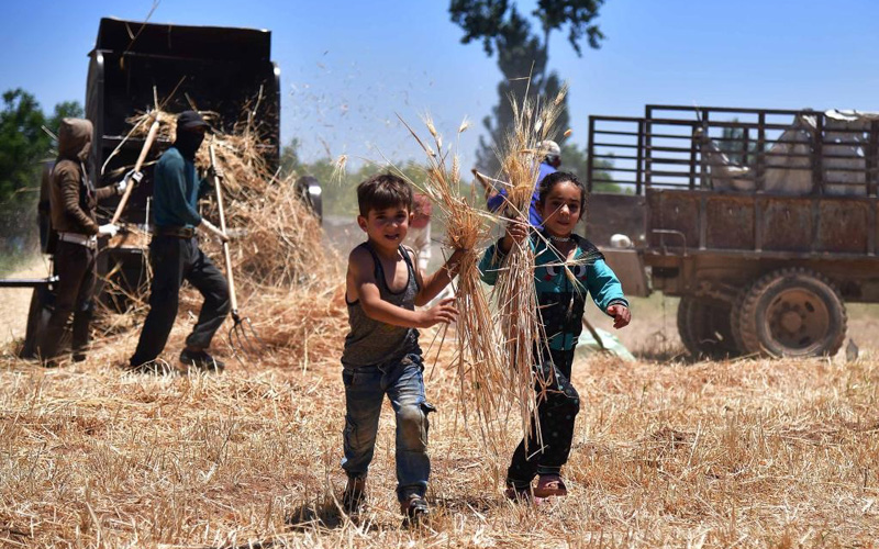 مزارعون وأطفال يوم حصاد القمح في ريف دمشق بسوريا.