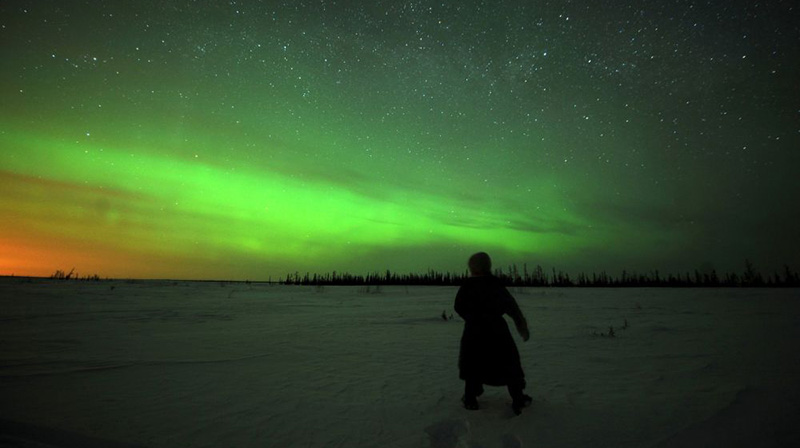 أهالي مدينة ناديم بمنطقة توندرا، يستمتعون بمشاهد الشفق القطبي، روسيا .