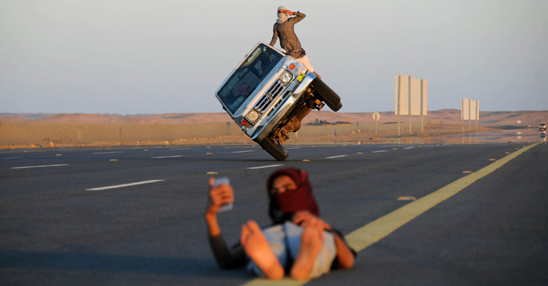 شاب يلتقط صورة سيلفي على خلفية شابين سعوديين يقودان سيارة على عجلتين فقط في تبوك، السعودية.