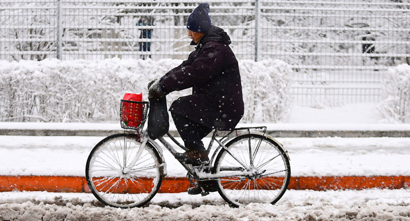 رجل يركب دراجة هوائية خلال تساقط ثلوج كثيفة في شنيانغ، الصين .