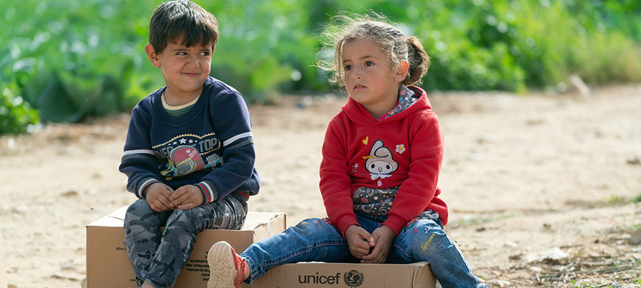 همام (5 سنوات) وأخته شام (4 سنوات)، وهم من عائلة سورية لجأت إلى الأردن قبل ست سنوات، يجلسون على علب تحتوي ملابس شتوية للأطفال.