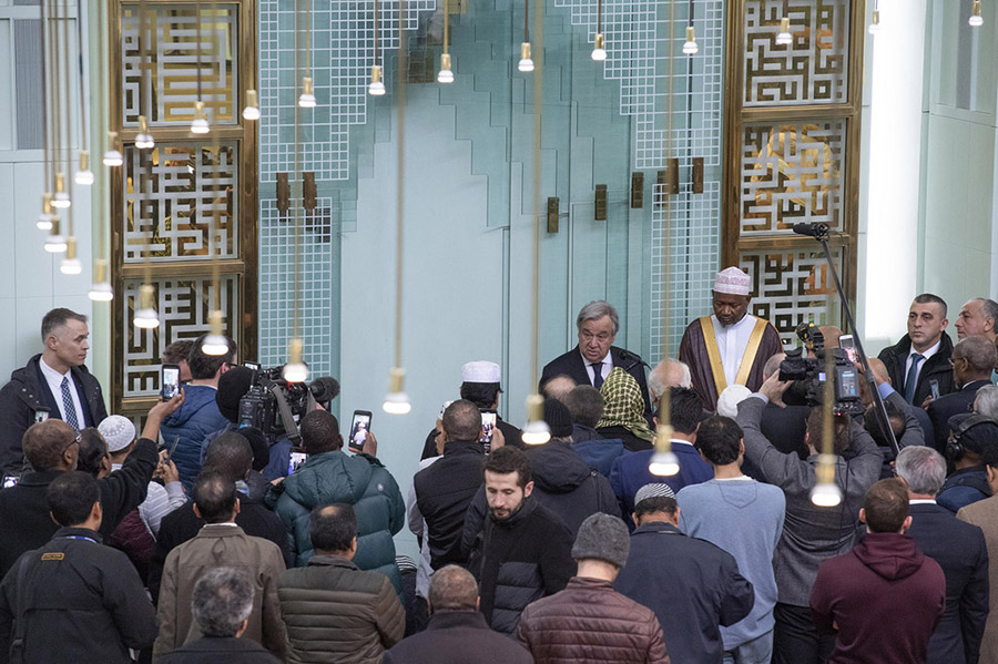 تعبيرا عن تضامنه ودعمه للمسلمين من نيويورك إلى نيوزيلندا ورفضه لكافة أشكال التعصب ومنها كراهية المسلمين، زار الأمين العام للأمم المتحدة أحد مساجد مدينة نيويورك، يوم الجمعة الماضي، بعد أسبوع من الهجوم الإرهابي على مسجدين في مدينة كرايست تشيرتش الذي أدى إلى مقتل 50 شخصا وإصابة المئات بجراح.